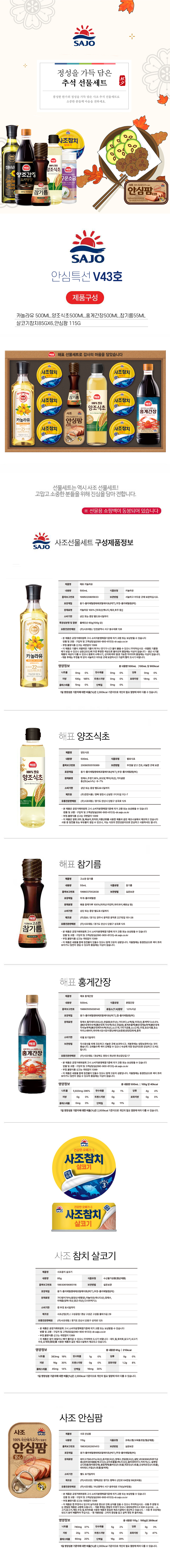 Ä«³î¶óÀ¯ 500ml x 1°³ + »ìÄÚ±âÂüÄ¡ 85g x 6°³ + °í¼ÒÇÑÂü±â¸§ 55ml x 1°³ + ¾È½ÉÆÊ115g x 1°³ + ¾çÁ¶½ÄÃÊ 500ml x 1°³ + È«°Ô°£Àå 500ml x 1°³