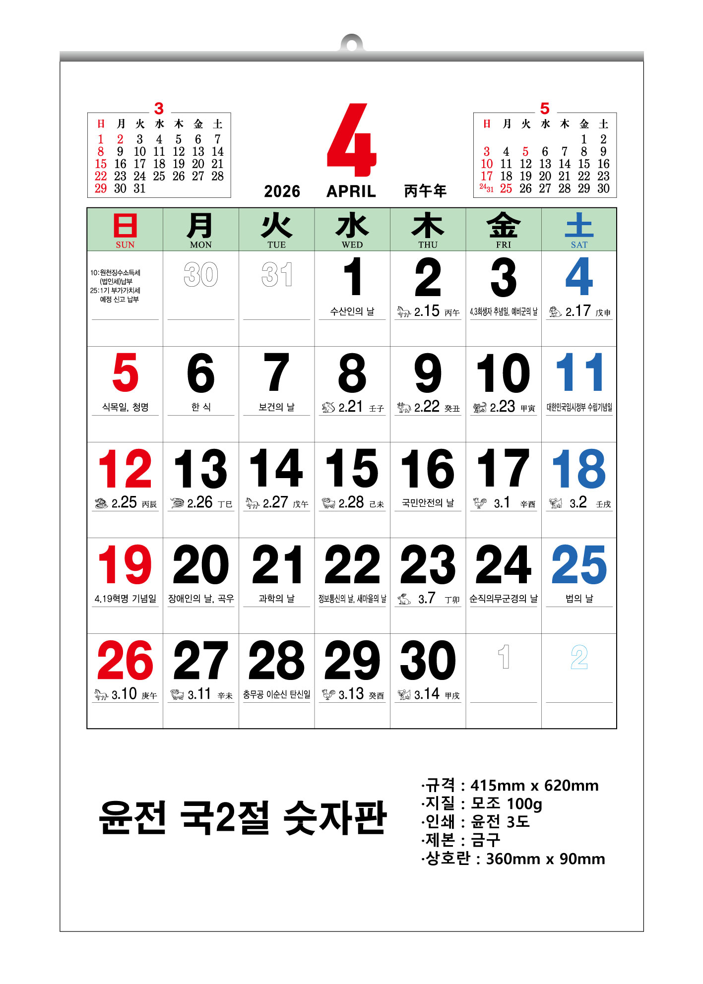 2026³â À±Àü ±¹2Àý(±¹¹ÝÀý) ¼ýÀÚÆÇ ´Þ·Â 415x620mm (100g)